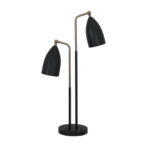 This table lamp has a antique brass, flat black finish that includes a metal shade.